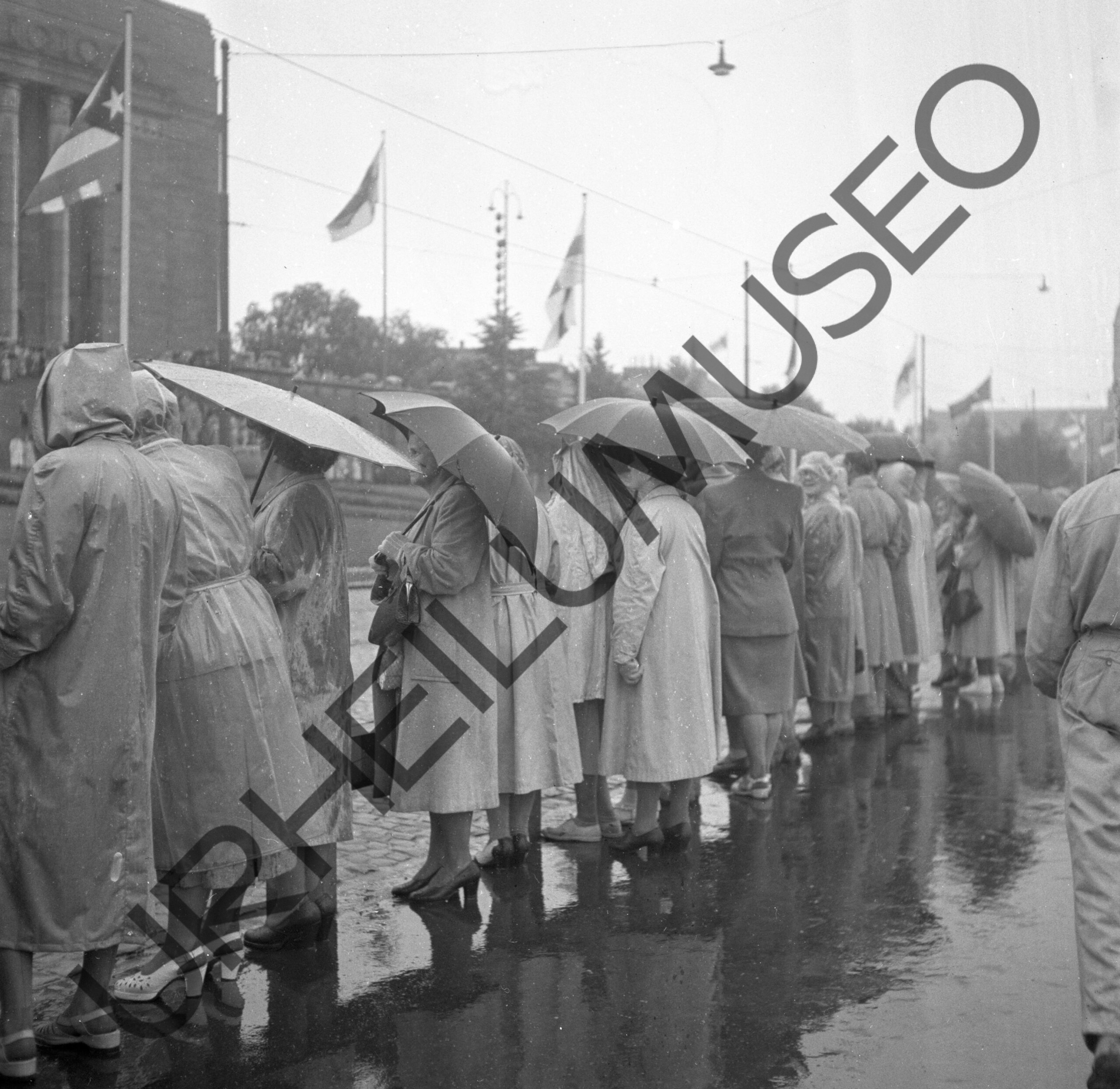 Soihtuviesti Helsingissä 19.7.1952. Yleisöä Mannerheimintiellä Eduskuntatalon edessä seuraamassa olympiatulen saapumista.