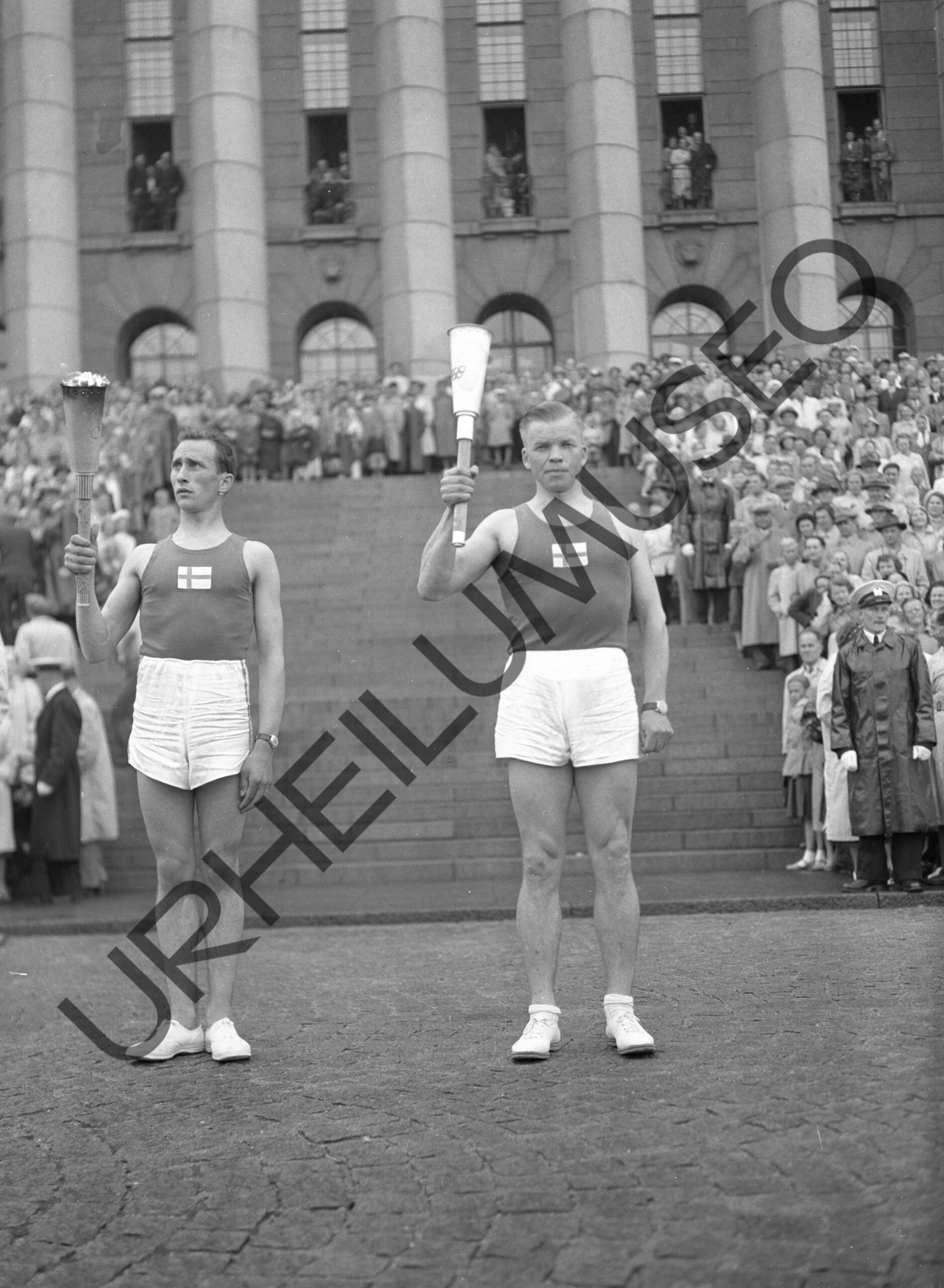 Soihtuviesti Helsingissä 19.7.1952. Kolmanneksi viimeinen viestivaihto Eduskuntatalon edessä. Tapanilan Erän Reino Nieminen tuo tulen ja Helsingin NMKY:n Mered Merisavo valmistautuu osuudelle.