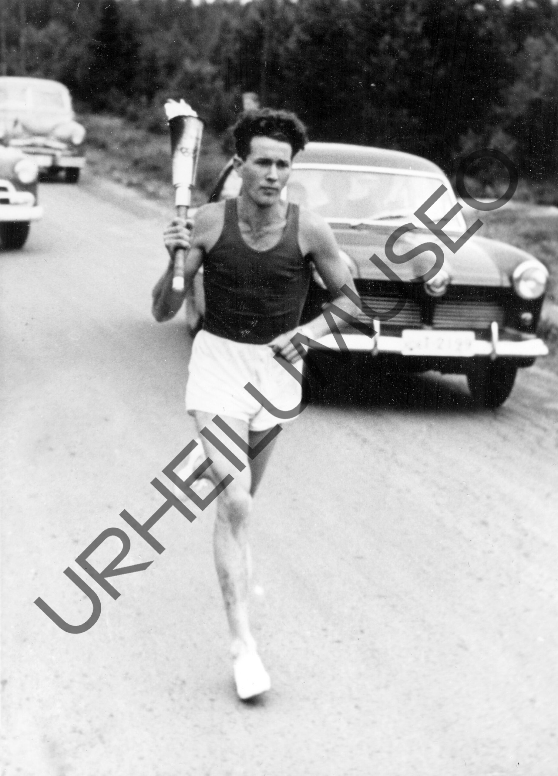 Soihtuviesti Vantaalla 19.7.1952. Soihdunkantaja juoksee maantiellä.