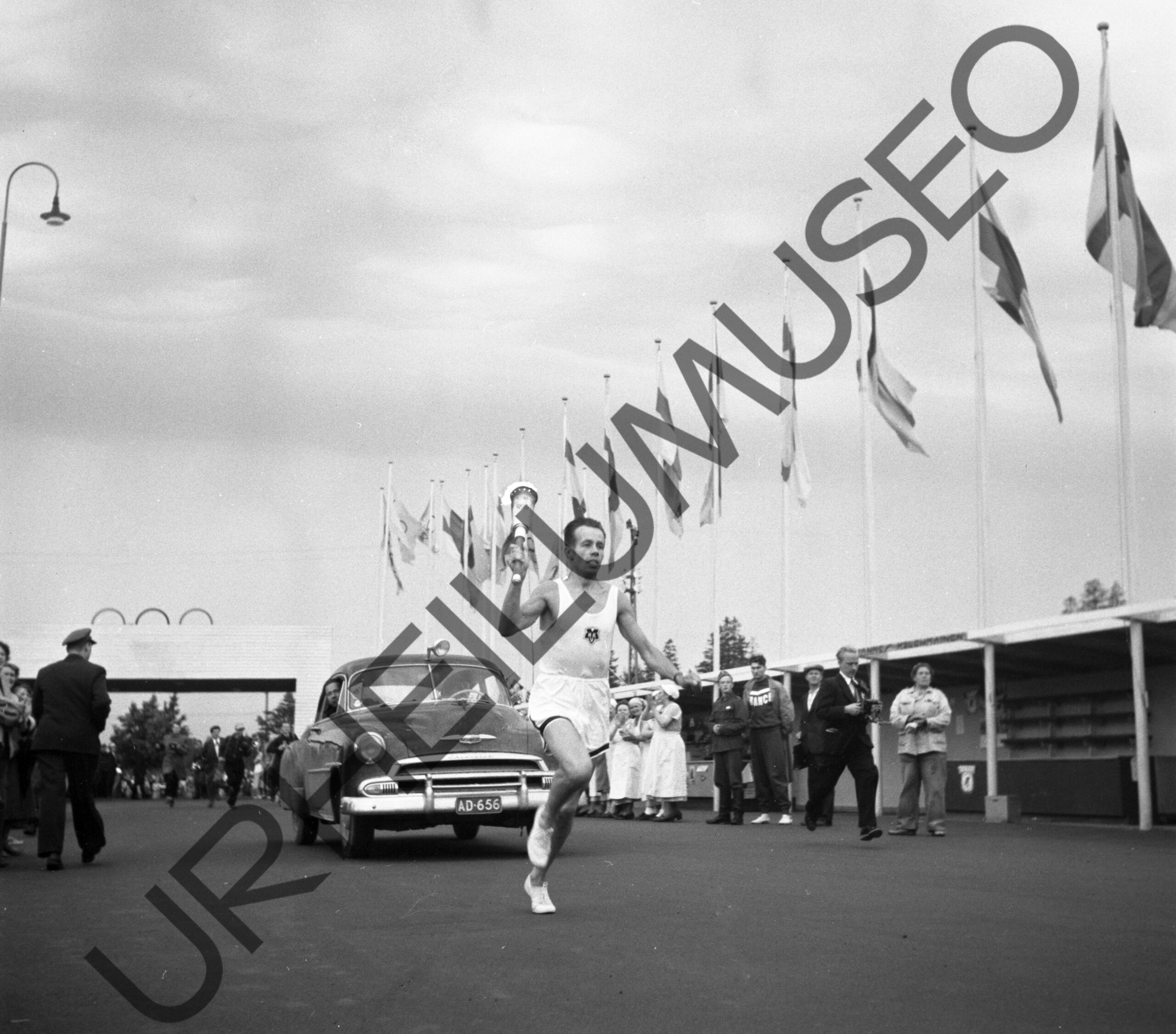 Soihtuviesti Helsingissä 19.7.1952. Helsingin Kisa-Veikkojen Aulis Patjas tuo olympiatulen Käpylän kisakylään.