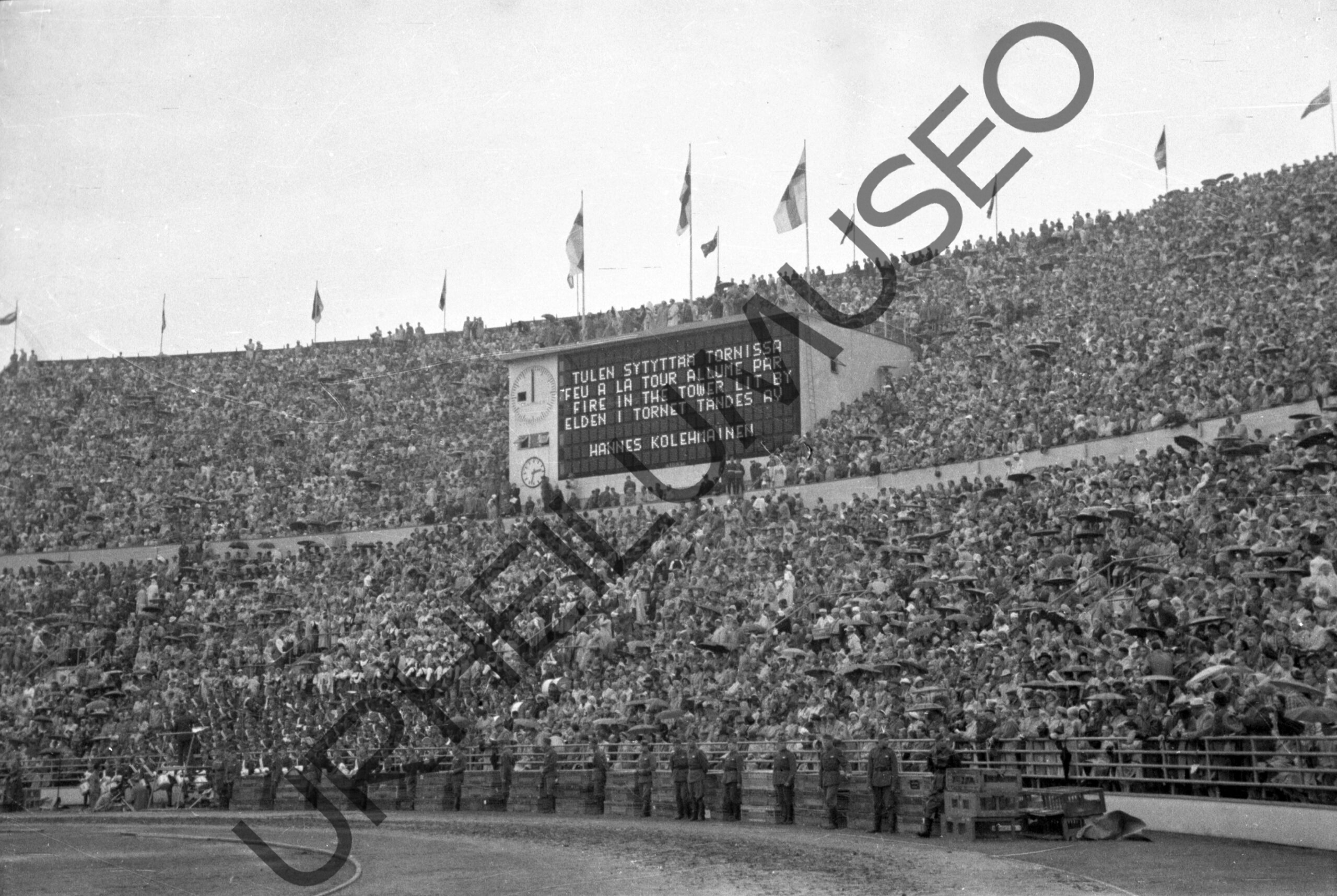 Avajaiset 19.7.1952. Tulostaululla lukee neljällä kielellä: tulen sytyttää tornissa Hannes Kolehmainen.