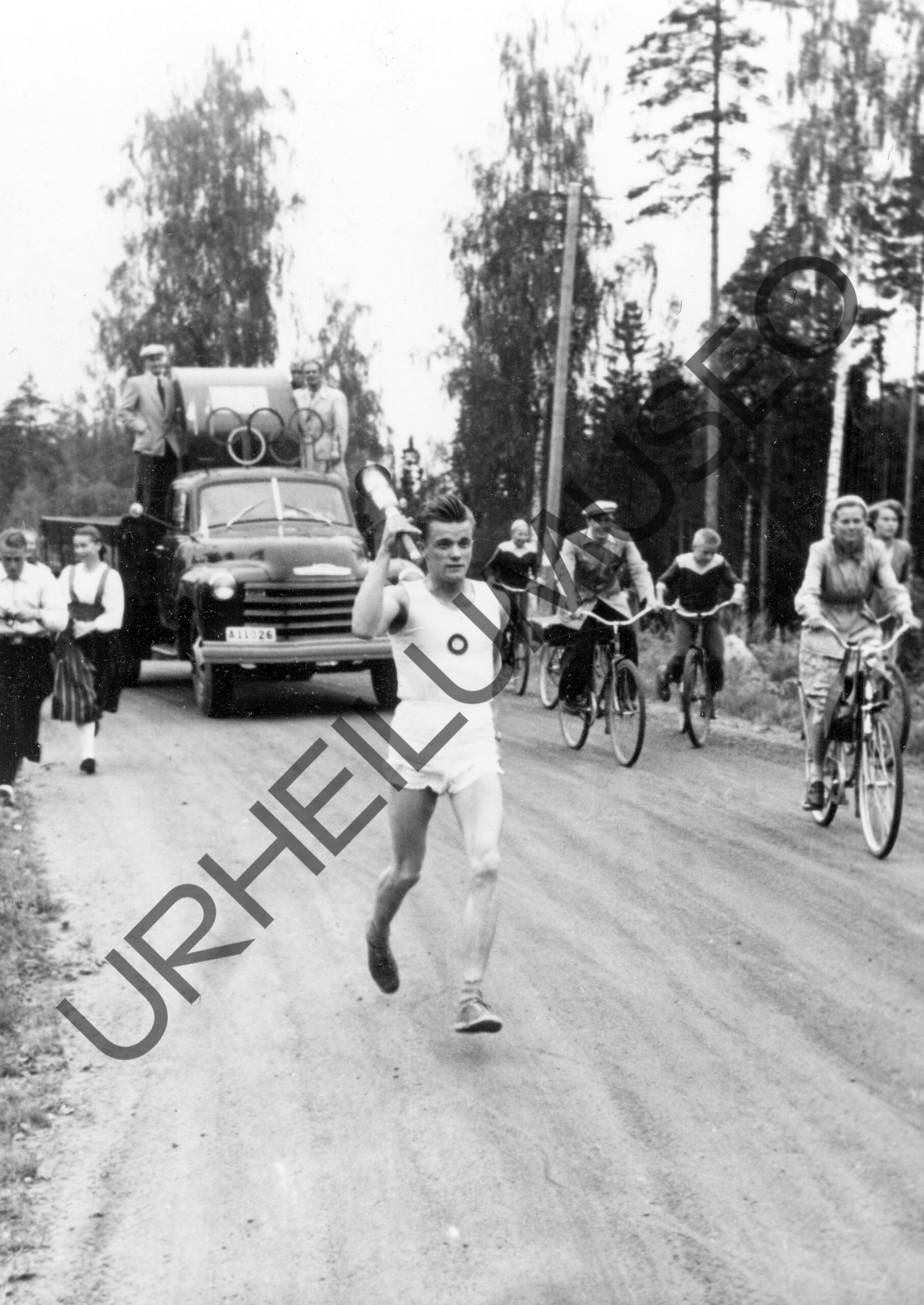 Soihtuviesti Nurmijärvellä 19.7.1952. Soihdunkantaja juoksee maantiellä.