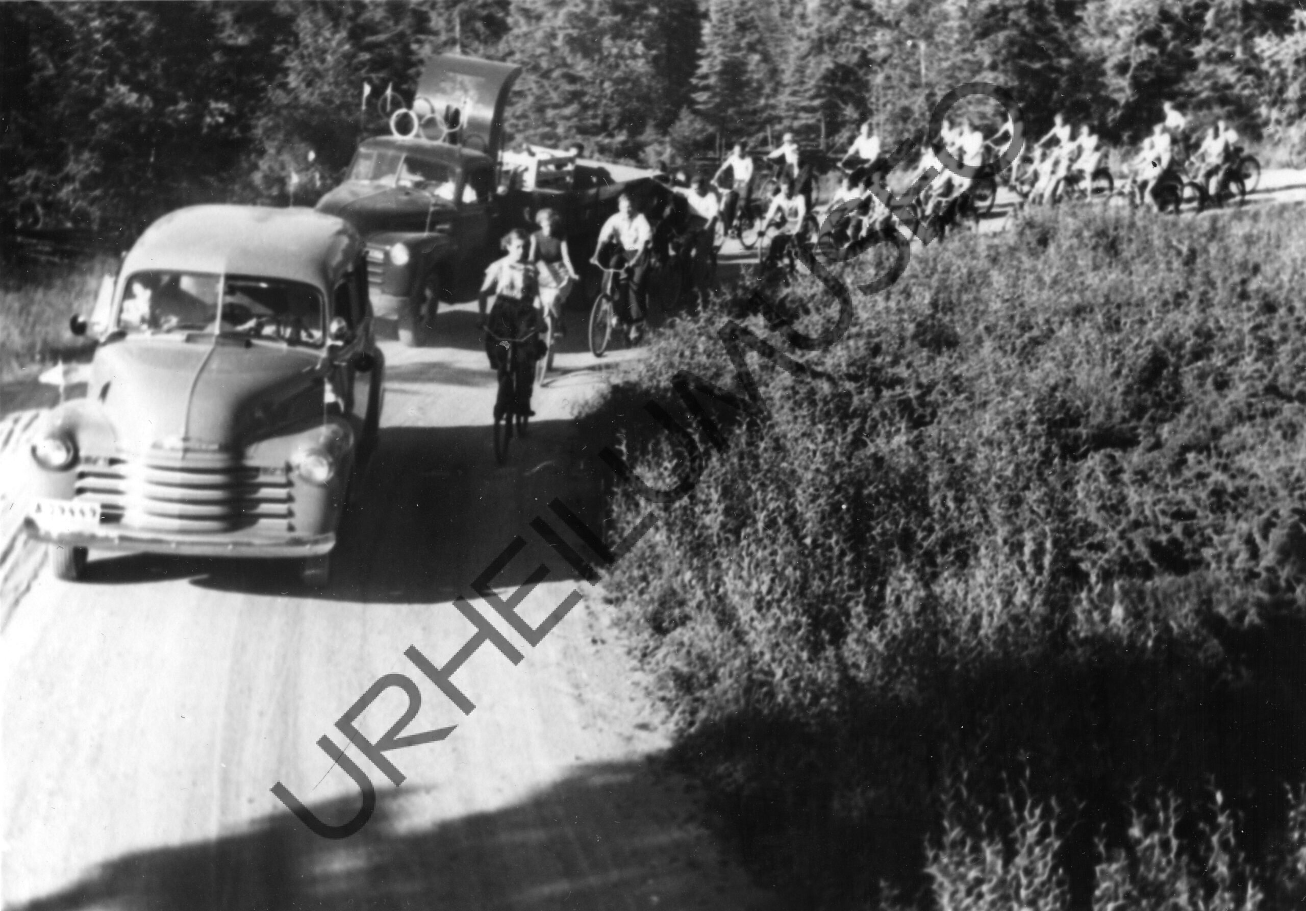 Soihtuviesti Pyhäjoella 11.7.1952. Pyöräilijöitä ja autoja metsätiellä.